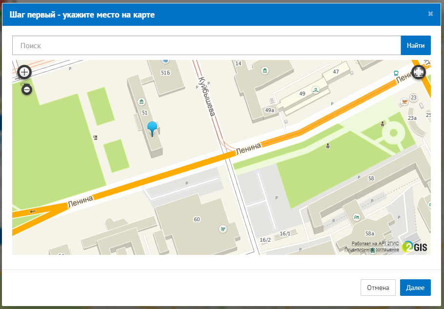 - Найдите место на карте, которое хотите отметить. Для этого можете использовать строку поиска по адресу и кнопки изменения масштаба.